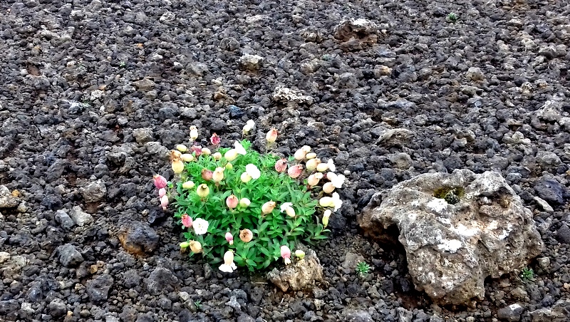 I walked volcanoes’s angers whose lava created dug and desolated barrens, disturbed in their black mess by some random seeds blown by opposite winds in order to spread flowers never named fighters even if they share the same nature. Thus, three blooms shine, brave in their hollow roots. Nature, even in the most unwelcoming land, always finds its way and blazes.