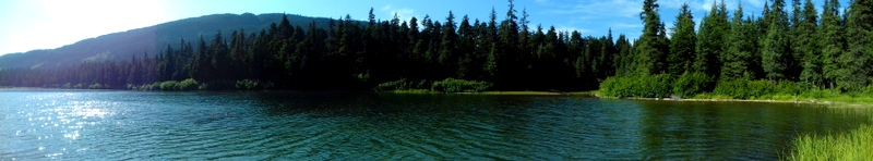 For my second day, I blend into the peninsula habits, working in the morning, hiking in the afternoon. We slowly start, all together surrounded by the bear bell sound, a walk under some trees not really giant but tall enough, whose branches hide some sharp and sometimes white mountains. Grayling Lake is peaceful and shinny in the torny forest sun, the translucent and smooth water calls for our warm and walking bodies, flying with wandering dragonflies. Happy. Simple. Easy. A magic moment. Neighbors, strangers or friends, we contemplate fleeting happiness, silent in the water swash. One floats, the other swims his foot on the shore and sunbath his body on the stones. Then we walk again, cool, enchanted and groggy. We want more and get enchanted by another magic on Meridian Lake banks. Its mesmerizing waterlily green matches its neighbor transparent calm water.