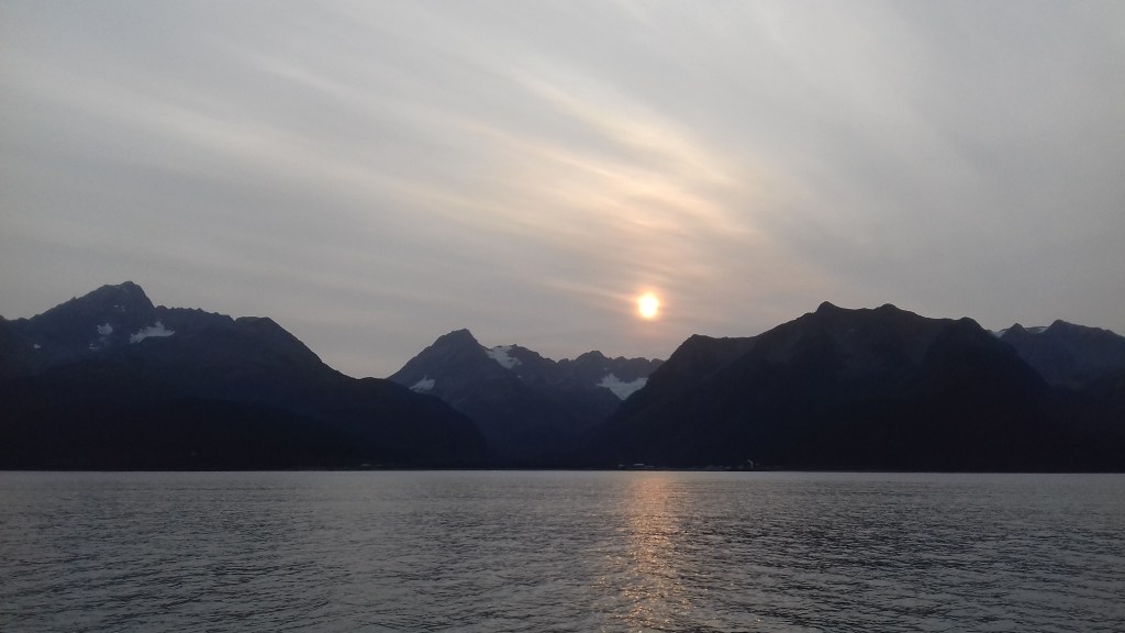 As I catch my actual ride to Seward, both late and early, I beautifully leave Anchorage. We barely have passed Rabbit Creek Road that Kenai grey and blue mountains, later covered of warm colors with the sunset, raise in this smoky morning. We drive along the bay, grey as well, where we should have seen, if it wasn’t low tie, some Alaskan whales; mounts softly gaze upon us. Chucagh State Park ones that I leave too early, Peninsula ones that long for my traveling soul.