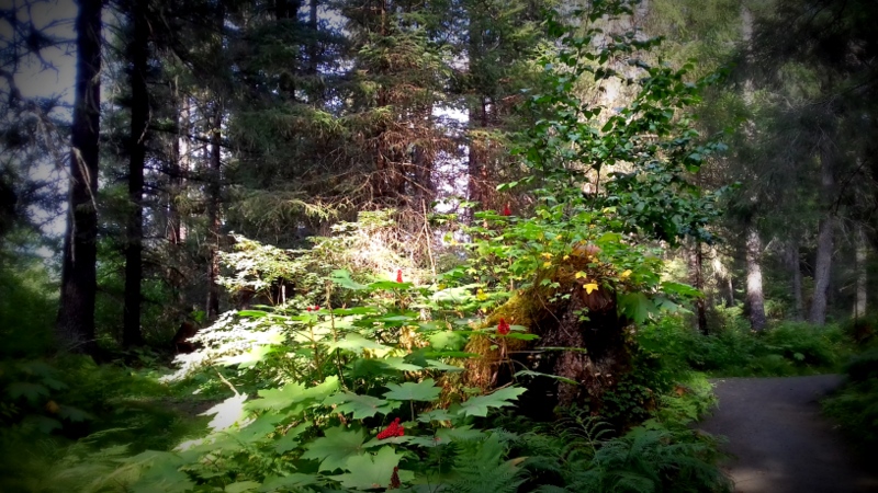 Sunday will finally be my lonely walk under one only airplane flight, in the dead salmons pestilent smell, on Bear Lake banks. To think that a week ago they swam their last breath and now, they rot in every Alaskan stream… It does mean fall is coming, despite the sweet afternoon breeze. I am once more enchanted by the devil’s club red matching the forest green, I am surprised by the Red Robin red that I unintentionally scare in the uprooted tree roots. I like the peculiar light of my afternoon hikes, when sun rises so low, soft and beautiful and free.