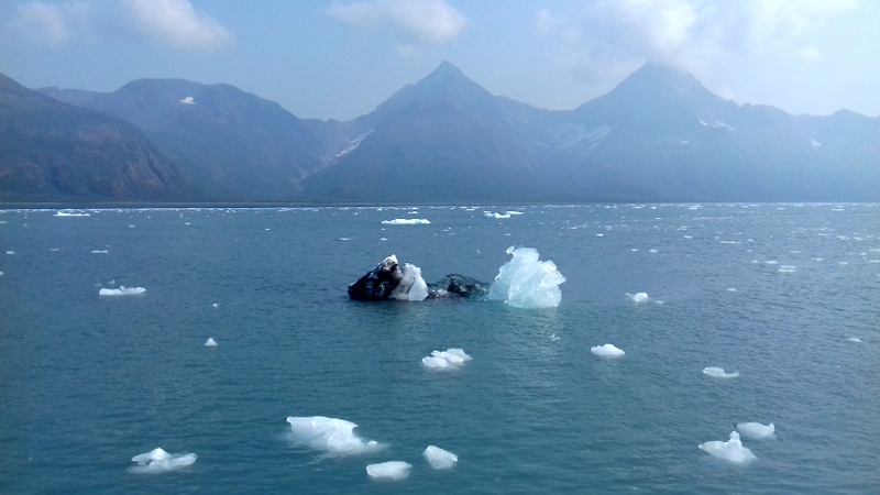I gaze at the sun shinning in the eye of the sea, in the boat freezing wind, I meet my first sea otters almost forming a raft, dancing in the sea. We get close to my first glacier in the water, translucent blue, mesmerizing blue. Tiny moving icebergs are sea salt sculpted. Lonely and abandoned by motherland. Fleeting and sparkling. Endless. Then, a bigger piece falls like thunder to meet its orphan brothers and get sculpted as well. A black mama bear and her cubs suddenly appear on the other side, summer colored, and try to reach the sky in front of my moved heart. They climb one after another, one is late and runs after time, too cute for his short paws.