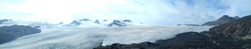 Then, we are standing on the last hill in front of the endless immortal ice. The landscape is absolute. Unbelievable. It a snow meadow where raise a few sharp rocky summits to the end of the world, the glacier might end two steps away from here, or most likely thousands of year away. It looks like a Siberian lake on the world edge. It is eternal and never-ending. I could stay hourless days gazing at this iced sea moving so slowly, invisible, towards the cliff, since the beginning of time, until the end of time.