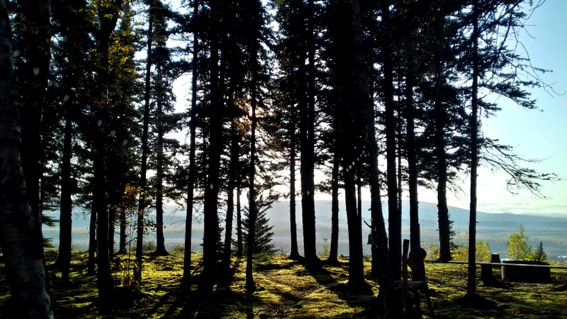 I wake up with the rain song on the roof for a few days, sometimes interrupted by wild geese’s fly, and I truly gaze at the foggy sea above Nenana River, hanging on my ridge. Landscape swings between rain and fog, I can’t see further than the forest. It is so cold. One day though, the humid veil gets thinner, breaking through a powdered scenery. Luminescent. And the pink evening sun, so low in the other side, shines on the other side pink snow. Magic. Beautiful. I think about Nur and what she told me about permanent sunset on mountains during Alaskan winter times. This night sun also reminds me of another red evening on the hill when trees were still yellow a week ago.