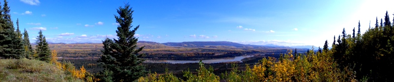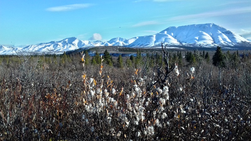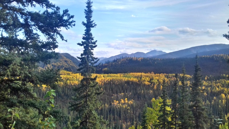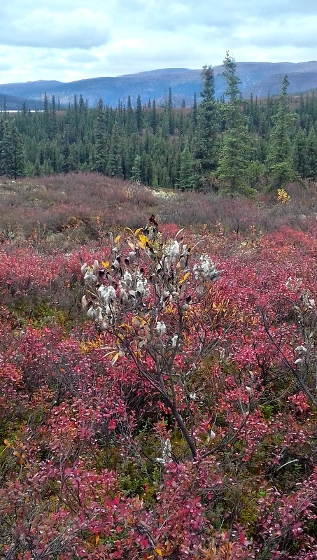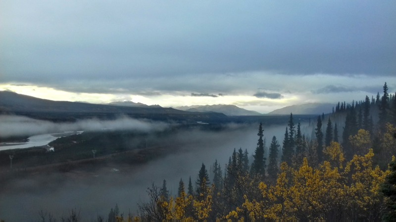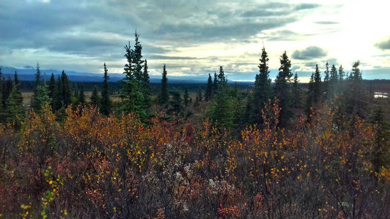 I hit the road from Anchorage to reach the North – or more exactly the Interior – of Alaska. On my hitchhiking way, I gaze at burnt summer trees, at redish fall trees, running frozen in my car window. Forest fires still stand against first rains, it doesn’t smell like smoke but there is a thin veil on clouds. Sun wins through some portions of cool wind though. I feel like I am crossing the border in between two worlds, or at least two seasons… Fire weeds, once pink, that got red from their roots towards the sky, are white now ; blueberries bushes are ardently blushing in the Norse plains, sometimes sharpened with an evergreen, often softened with a fragile yellow tree. It is already fall time here while Seward has kept its summer blue all over the peninsula. In a few weeks, winter will already be here and the first snows will blossom but not stick…