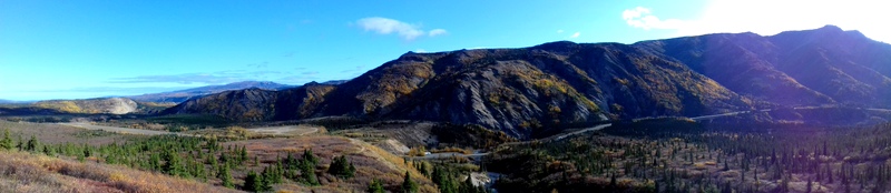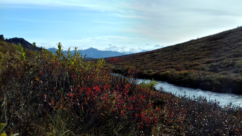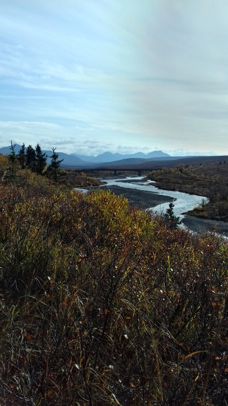 By a windy sun, I get for the first time into Denali National Park trees with Hannah, her mum Agnes and her son Charlie. I therefore countdown the road I rode the previous weekend discovering new wonders the way in kept for itself. I am breath-taken, bulging eyes, racing heart, on the hanging bridge in between Bison Gulch and Dragonfly Creek, on the flying bridge above Nenana River. All the colors. The sudden depth of the view. Improbable. Pure. Simply stunning. No matters how many times I will cross this bridge, even when the landscape will have faded, my heart will skip a beat every time. When we finally got to the Denali preserved wilderness, every piece of landscape attracts my eye, eager to guess every shade of fall. Each season gets its own wonder, it is so amazing to think about the low mesmerizing deterioration of a scenery’s colors, endless and shinning, in autumn. We reach Savage River, the last accessible piece, and walk more quickly than I would like a sample of the rocky landscape as the river in running towards the naked valley in our back. No matter the brevity, I enjoy this blue sky sunny walk, even a bit too much overcrowded for my taste.