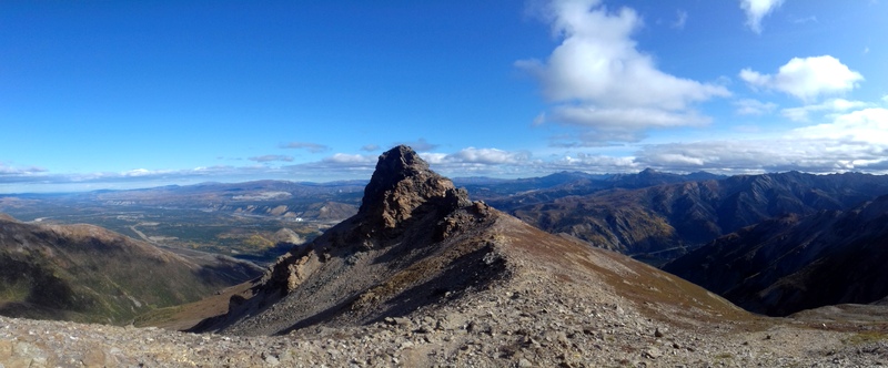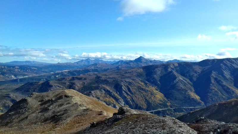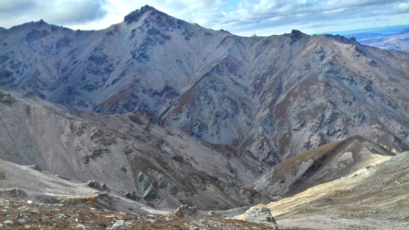 My legs forget they are going up hill for a while, time to cross the sunny and windy ridge, they want more looks of drying mountains. My vertiginous soul wants to fly above sculpted rocks. Thus, I rise and look the further I can. I struggle with crumbly grounds that brings me to the top but never to the end. I would like to see the view over Nenana River and the bridge, that moved me so much three days ago, but my geography got lost once more. I keep going closer to the clouds to see the next cliff, the next endless and uncommon view. Translucent water shinning down to Hannah’s. Basalt pink playing with the clouds. Ridges that could lead me to Alaska heart if I wanted and was not frozen. Then, I happily go back, never bored of this changing landscape, because I am looking the other way now and the wind finally stopped blowing clouds more quickly than my breath. It took me more than four hours to get to the top and I go down like a flashlight, lighter despite my knobby knees, despite my thirsty throat.