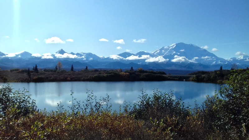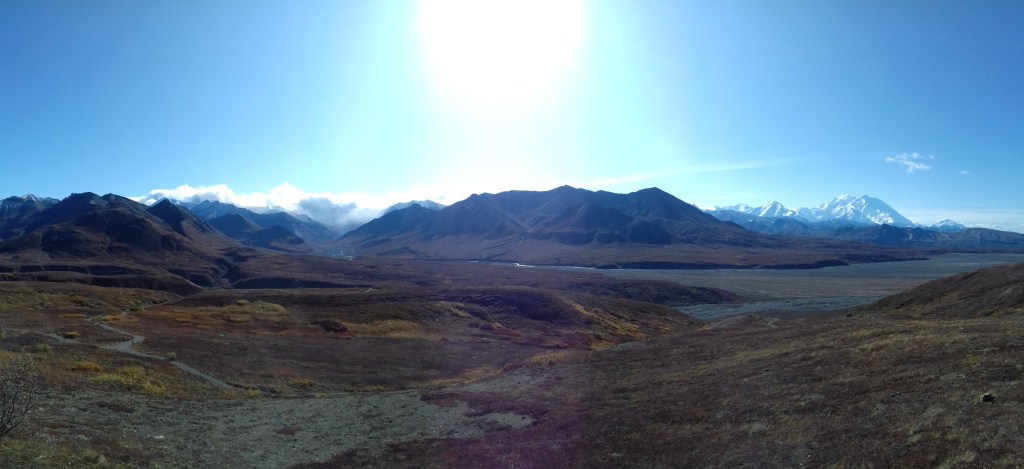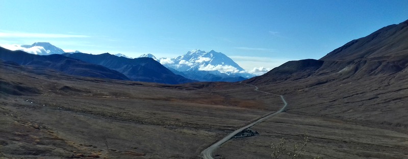 Thus, my tired feet follow the road along a totally different scenery than yesterday. It is not a cloud wall anymore along uncertain and blind McKinley River. It is a majestic white summit range, sometimes headed with a cumulus. I walk though, mesmerized by this giant landscape, to the bus that will drive me to where I come from. I would like to stop at Eilson Visitor Center for a last hike but bears closed all trails. Instead, I look the invisible view of yesterday, windy in the American flag. It takes my breath away and the universe’s I would think.