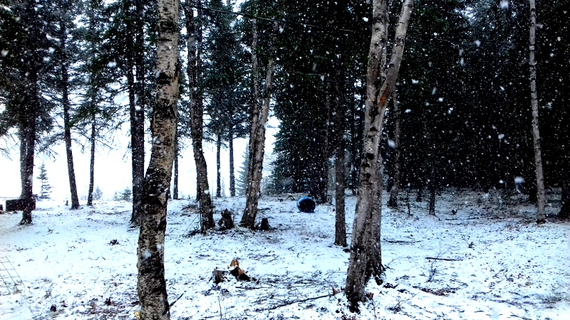 However, Saturday morning is slightly covered with frost and snow in a first shy sunbeam. The blue landscape amazingly smells like ice. It then snows heavier as we try to finish the barn, my first end of summer project. It such a different atmosphere from that Labor Day weekend’s singing wind; today, we and King Bob try to warm up near the sparking timber bonfire. From time to time, some light ray go through the trees, immediately melting the sky’s iced tears.