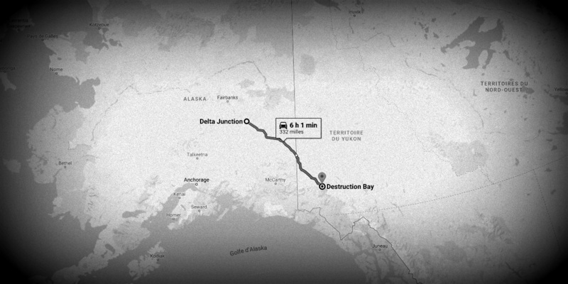 I wake up way to early in Delta, night is still pretty dark but cold numbs my sleep. I survived the night and my anxiety slowly goes away. Writing down my last adventures before hitting the road again, few surrounding mountains, invisible last night, progressively shines in the morning light. It is then time to keep going, I cross dozen of snowed filaments only remains of overflowing rivers, blazing in the open space they give towards landscapes. Mountains’ shining white explodes hundreds of fireworks in my eyes to Midway Lake’s frozen Christmas trees island, that my camera can’t immortalize because North American has this strange habit to put view points stops when you can’t actually see the view because of trees; but my retina remembers. My numb heart takes the excuse of Hidden Lake to stretch my legs and follow bears’ prints. The landscape melts after that, it is autumn dead without winter unreal colors; and I think about Chena River’s two solitary golden trees, odd and late in the frozen wilderness, they didn’t get the memo: snow and winter are here.