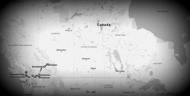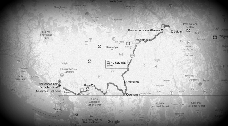 I hope the valley will pierce clouds layer at some point. Lost cause… Arrived at Revelstoke, lovely in the few hazy mountains, I try to catch up with my freeze-frame delay, only getting a glimpse of the town. And I actually change my time then, I have left the Rockies. This extra hour is welcome but not enough, I still have too much of a long way towards West to delay sunset.