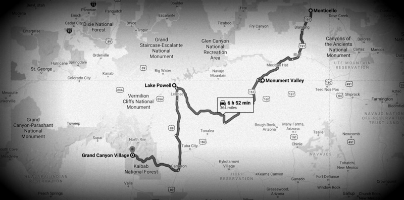 The next morning, I hit US 89 road again, the one that blew my wandering from North to South, the one I left a bit before Salt Lake City, the one following Colorado River meanders today, bumps and detours towards our planet’s heart, towards its bigger canyon. I think it will keep me company all the way down but I lose some altitude too soon and the river gets invisible.