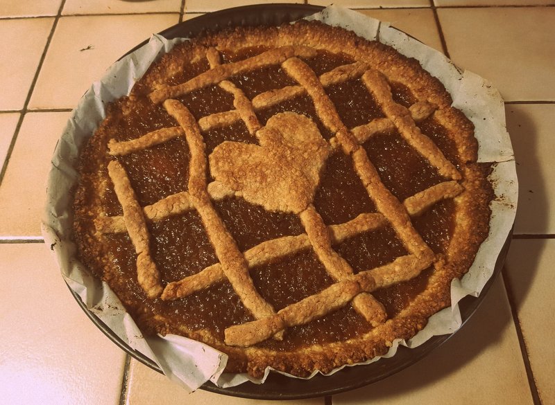 Roll ⅔ of the dough and spread it at the bottom of the mold. Cover with rhubarb jam (recipe below, preferably made the previous day). Roll the remaining dough and cut into strips. Place these strips to form a lattice on the cake. Brush the lattice with egg yolk.