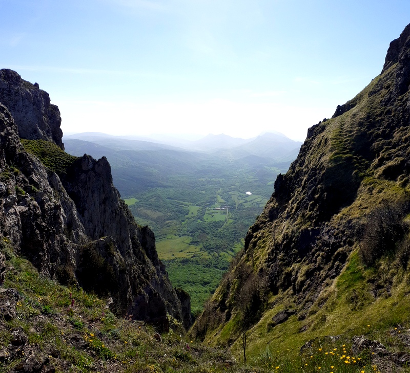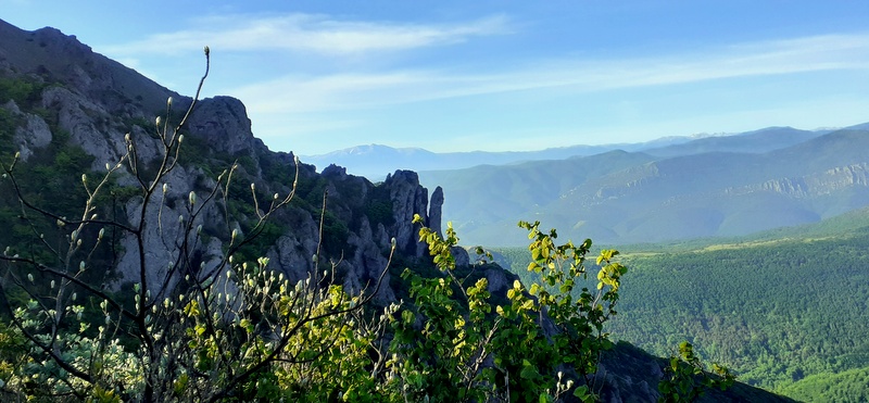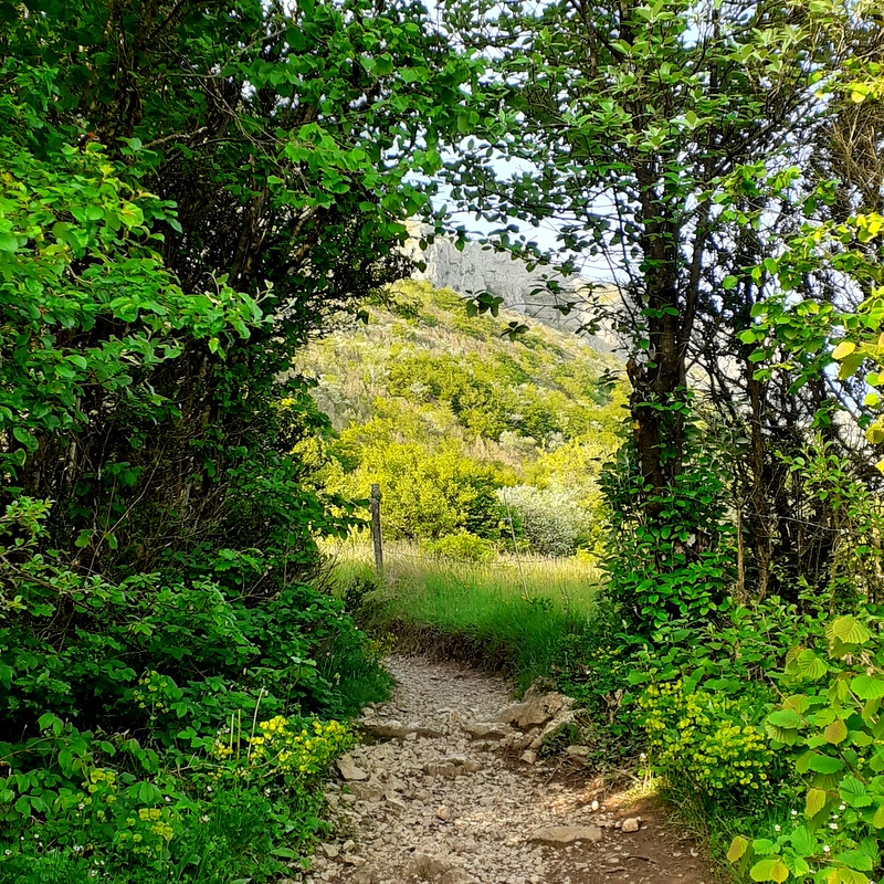 Then, I humbly presented myself, full of my personal myth and guided by my own vital quest, to Bugarach’s feet (or was it its head since it is reversed?), finally freed of haze in this Wednesday of May. I chose the shortest trail and I started in the heart of the matter since the Pech welcomes you with no introduction, head first on steep hill. The first kilometre is not the prettier, muddy and blind. And, if getting higher gives you a better and better look of landscapes, it is not before certain vegetal arch you are truly able to enjoy the scenery.