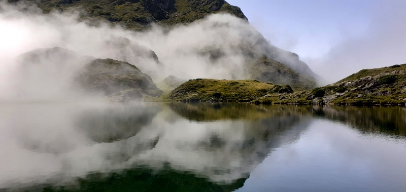 Thankfully, Gods still have some kindness for Humans whose mortality and imperfection are so desirable for them; they distilled one last magic to golden my better world’s utopia. At the end of our alpin halt, a steamy fog ephemerally swept waters’ beautiful mirror and took any sorrow towards Heaven, and erased any bad memories. It was so fleeting we almost indescribably felt like it wasn’t real. It was simply mesmerizing. We couldn’t get tired of it, amazed each time by this hazy waltz.