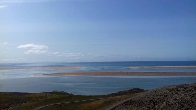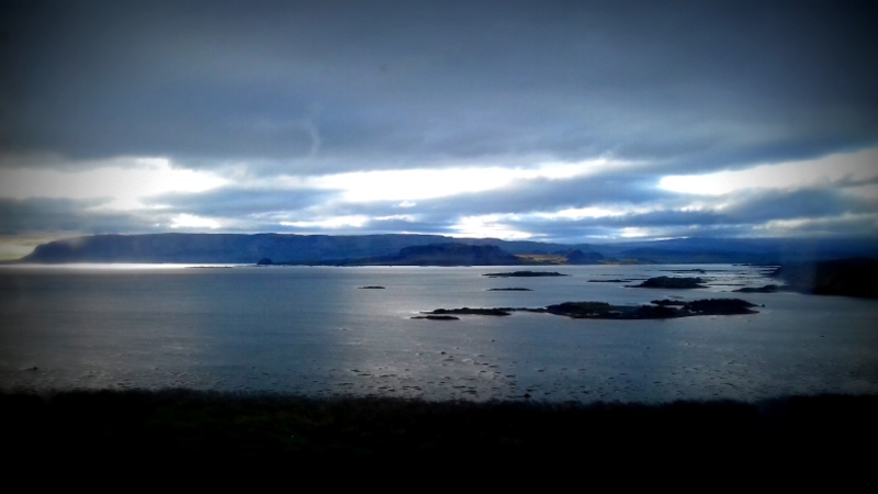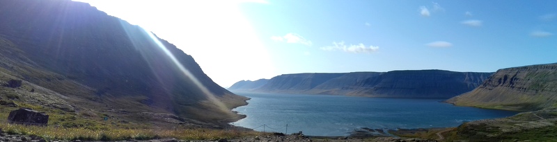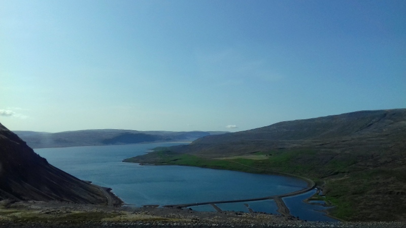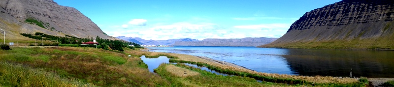 Then, after an apricots and almonds snack and a longer wait (but not as long as the morning one), a new Jeep, driven by a local couple, owners of the campsite I almost chose yesterday, stops to give me a ride to Patreksfjörður. There, I wait for my new car so I can reach Reykjafjardarlaug. I eat three sour cream & oignons chips, and a fisherman picks me up, apologizing for the fish smell. He offers me a ride to Bíldudalur where I wanted to go for the knitting lady… On our way, we talk about the Icelandic political and economical crisis, and the new citizens Assembly that happens to be a myth**, and the new constitution they wrote but was put away in a drawer by politicians: “thanks but no thanks”; we talk about their failed attempt to get ride of the old system. Thus, my Icelandic ideal, my hope for a brand new world, was crushed as so many, peaceful or not, revolutions were before. This fisherman also tells me about his law studies, his student buddy that taught him how to drink wine, he explains to me his choice to be fisherman instead of debt collector; crisis started when he just graduated, fish price blew in one night, a much more glorious fate than the only accessible job considering his degree and the economical situation. All our passionate speeches freeze when I first see Bíldudalur Fjord jumping in front of my amazed eyes; he loves to pick up hitchhiker so they can remind him of the beauty of his own country.