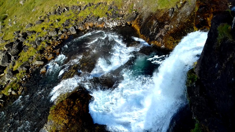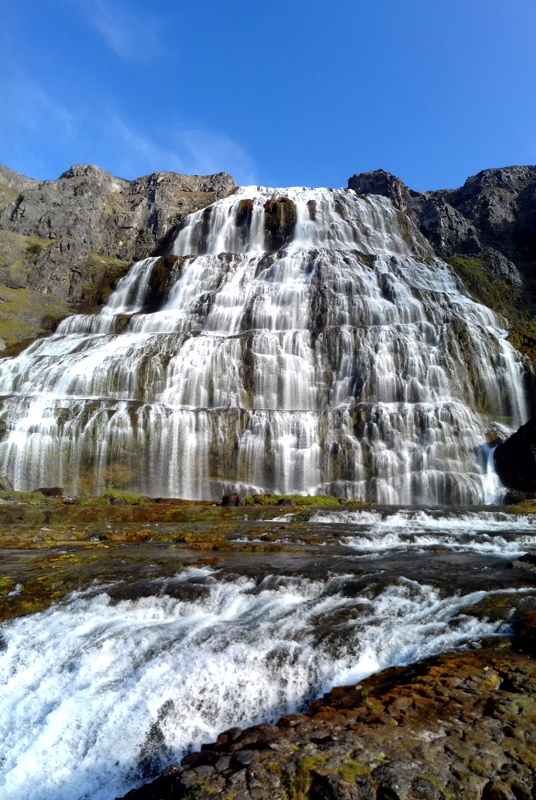 We finally reach our common destination: Dynjandi Fjallfoss. Once again, these endless and never-ending waterfalls are impossible to recreate with my words, from the winding entrance in between two lands so the wild water can rise as a vivid and exulted torrent to the ultimate waterfall that feeds it and quietly shines. from rocks all along the way were sculpted a long time ago, by some invisible hands, and stand like a castle’s ruins to the almost mesmerizing moss’s green, striking compared to the summit’s sharp rocks. The whole nature moves on a blue sky and sea background, while I can see in the thin earth arm another Fjord where clouds stopped for the invisible night. The sun slowly gets closer to the horizon and throws some new cold and warm colors on the landscape.