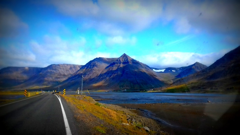 We linger at every viewpoint; however, I decide not to stop at Reykjafjardarlaud, disappointing. I can’t believe what runs in front of my eyes, canyons, desolate and endless snowed Fjords, hidden waterfalls sometimes, ocean lakes in between each growing land, blue water, green sometimes red. Untouched landscape. Icelandic lines seem so pure, like in North America, because there is no man’s hand behind it. I am deeply moved to think nature build such a giant beauty. Caught in my huge emotions, I finally understand what I feel: I understood what a Fjord was supposed to be, piece of land that play monster tag with the sea, but I couldn’t picture the reality of it, I didn’t expect such a thing. You could think you would get bored after a while, after the same repetition over and over up the desert plateau and down a colorful nature, down waters and lands; yet each new Fjord has its own particularity and beauty.