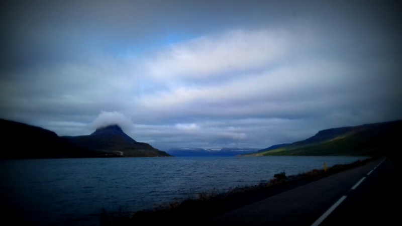 Arrived to my destination, I look for the knitting lady, she stands at the corner, tiny and humble, with the only treasures she has left; I buy some new socks, for a friend this time. And my wait starts all over again, in front of the still Fjord, gazing at clouds drawn on flat or sharp summit. I wait for such a long time, hoping that I will eventually reach Reykjafjardarlaug hot pool, I have plenty of time though. Thankfully, a car with hilltop bikes stops, driven by Krzysztof and Łukasz, Polish that travel over Iceland because Łukasz has baked here for three years.